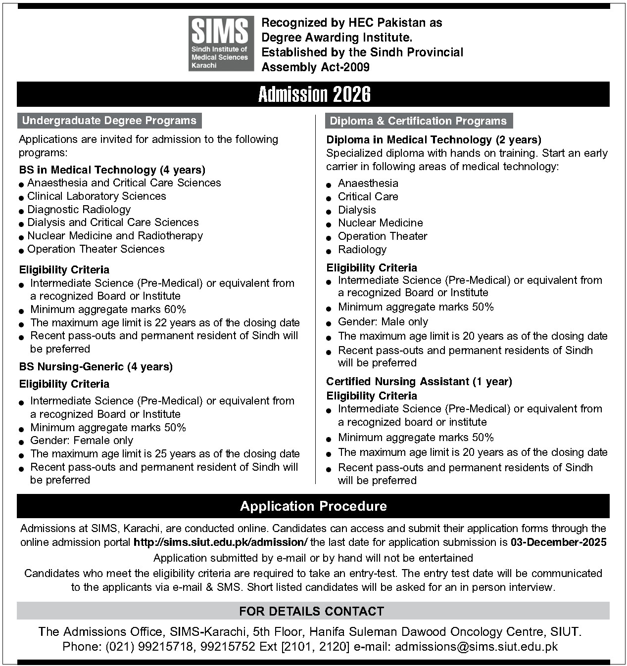 - If you have any query please email at admissions@sims.siut.edu.pk, you will get reply within 24 to 48 hrs (working days) or Contact on given numbers : (021) 36242101- 36242120 (during office Hours 09:00am to 05:00pm)